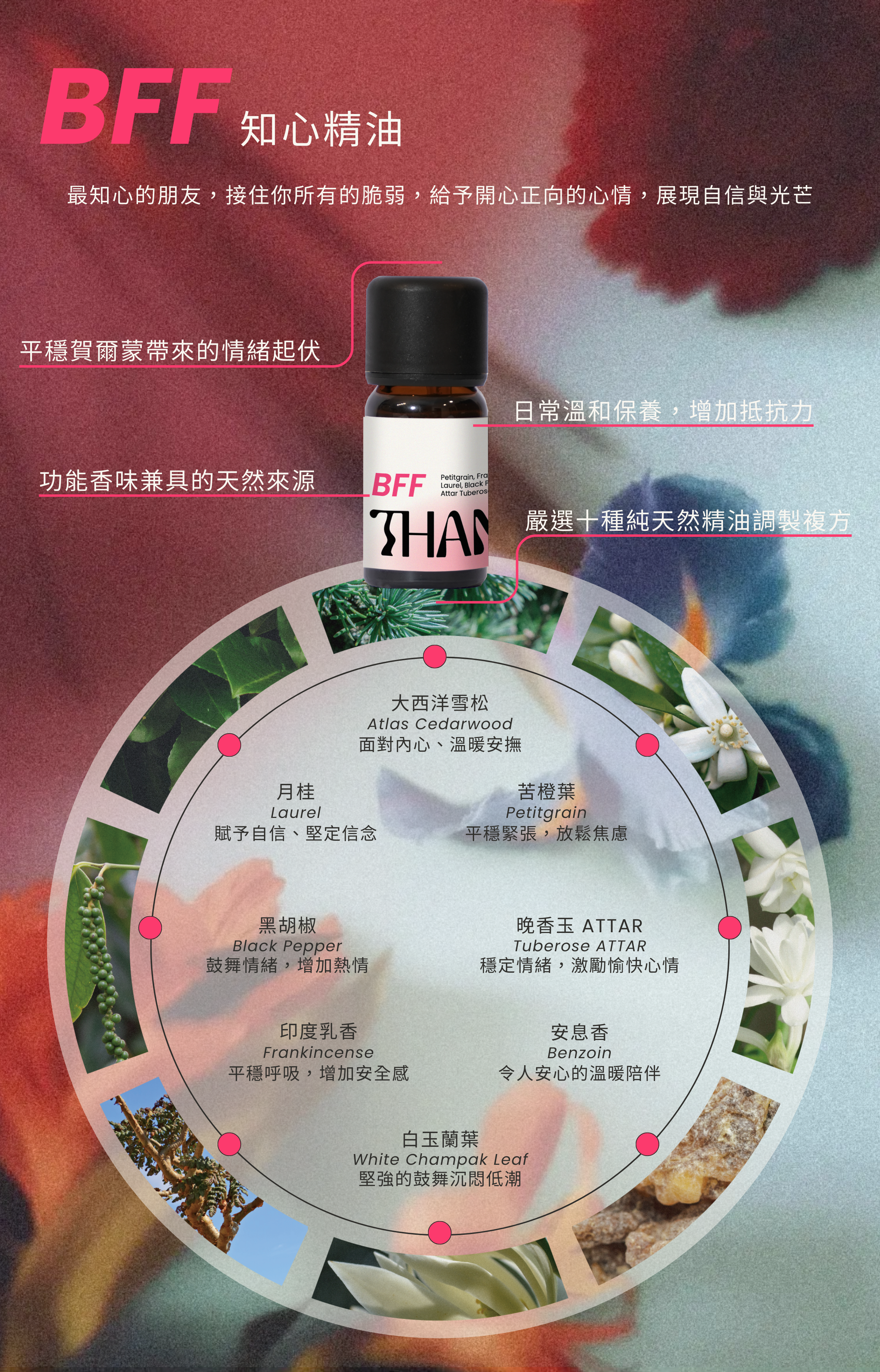 BFF 排解的負面情緒比較像是『鬱悶』,像是有苦衷沒有人可以傾吐。BFF 裡含有幫助打開心結的苦橙葉,也加入了白玉蘭、晚香玉、依蘭等花類精油注入安慰