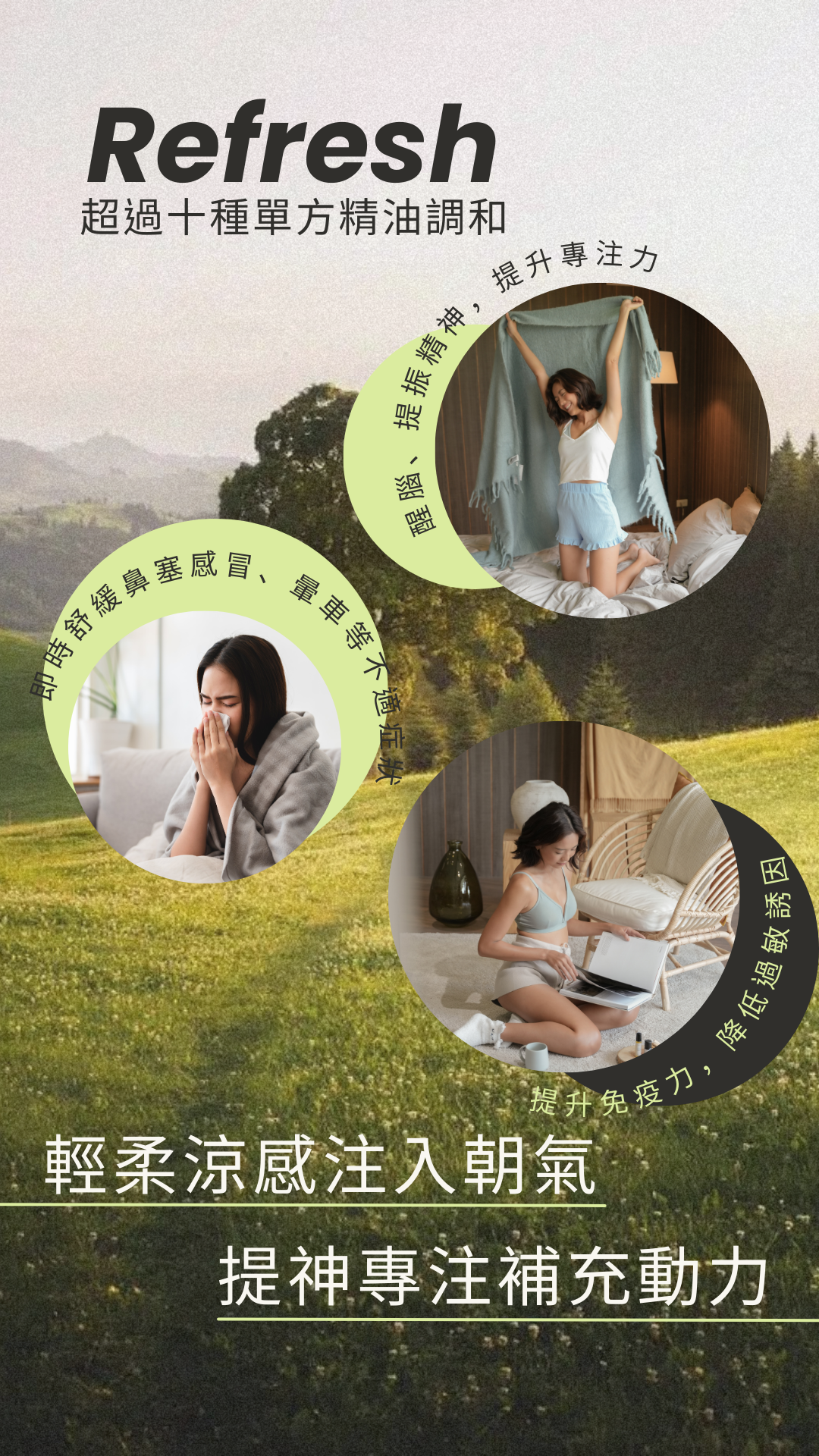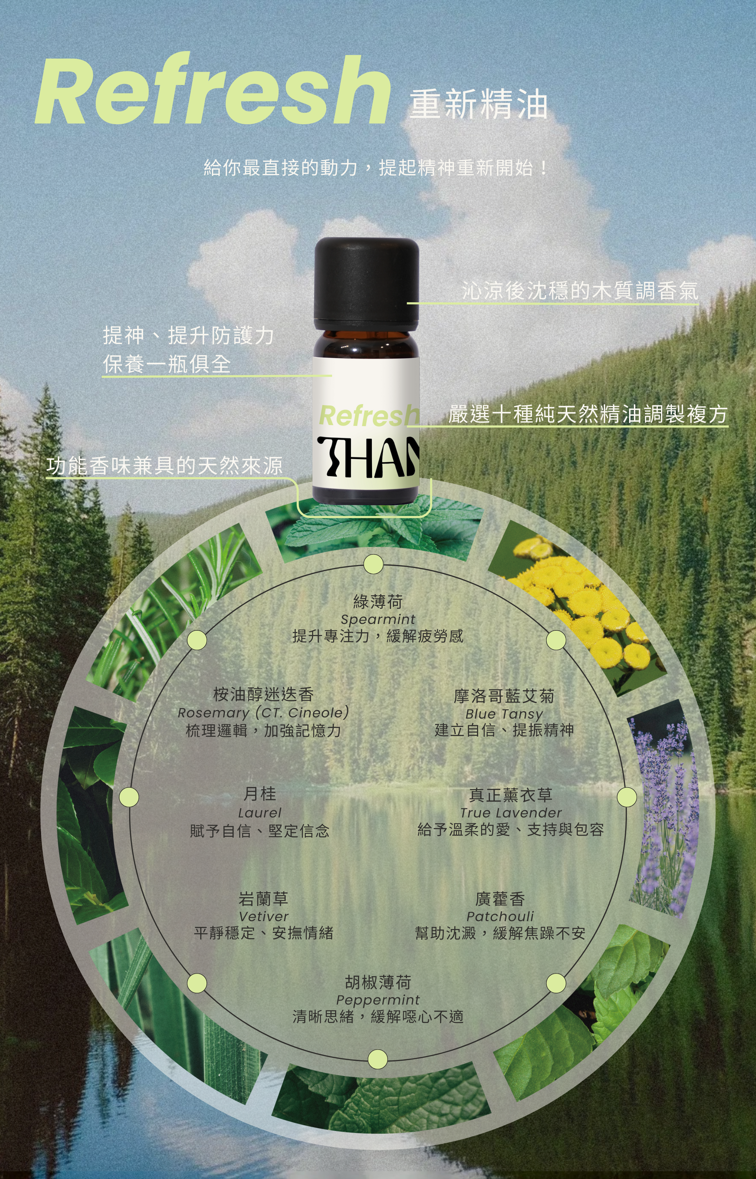 Refresh 添加了10種不同精油調和,就像精靈穿梭在森林的身影,活潑且明朗。特別選用兩種不同的薄荷提升涼爽層次,幫助提神和專注的效果,在清新的薄荷中,加入平靜沈穩的真正薰衣草,和諧地在兩個相反的感受中達到平衡。