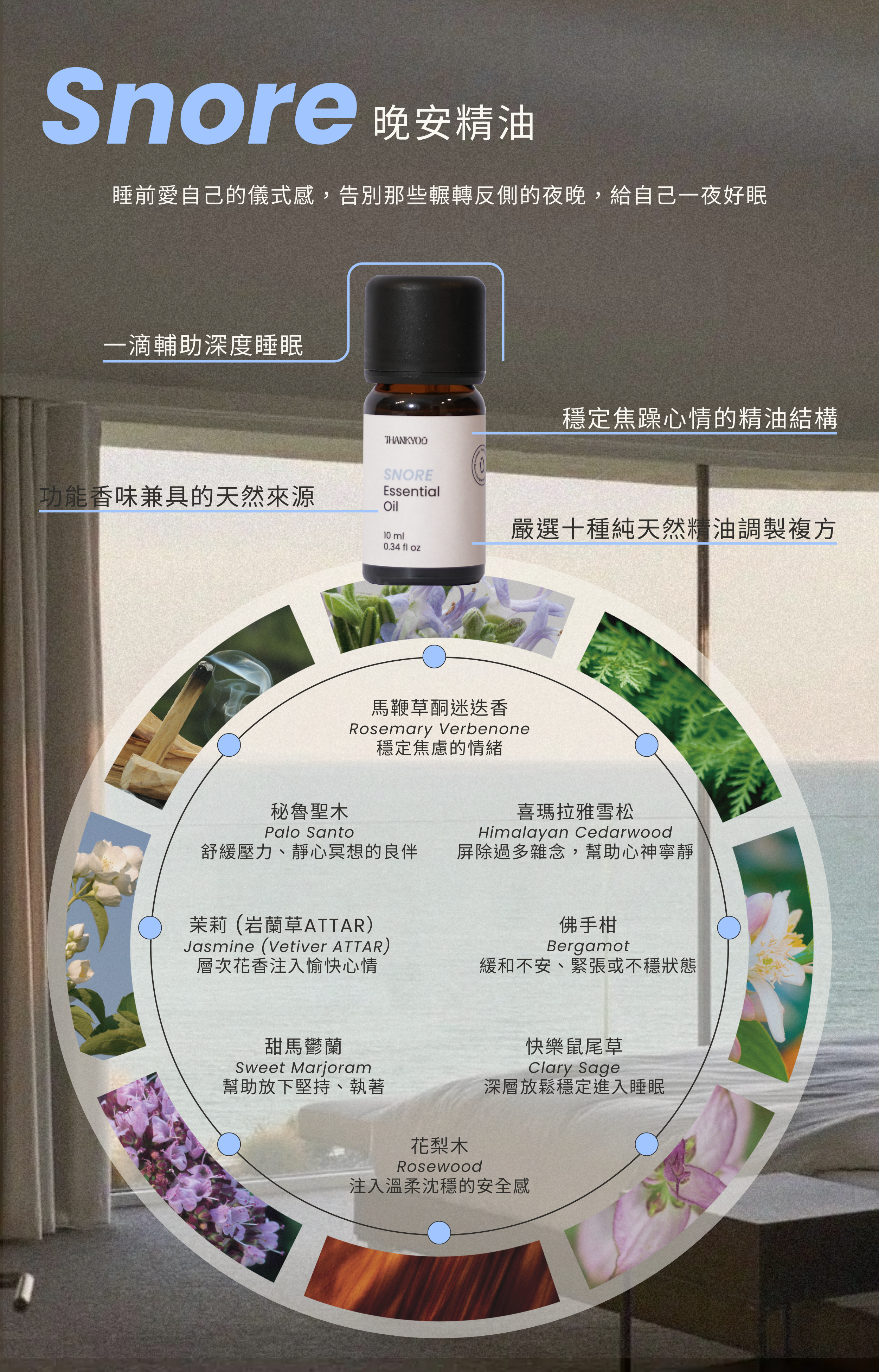 Snore 對於焦慮、煩躁的情緒,透過花梨木、秘魯聖木等木質精油達到鎮定、平靜心情的作用。