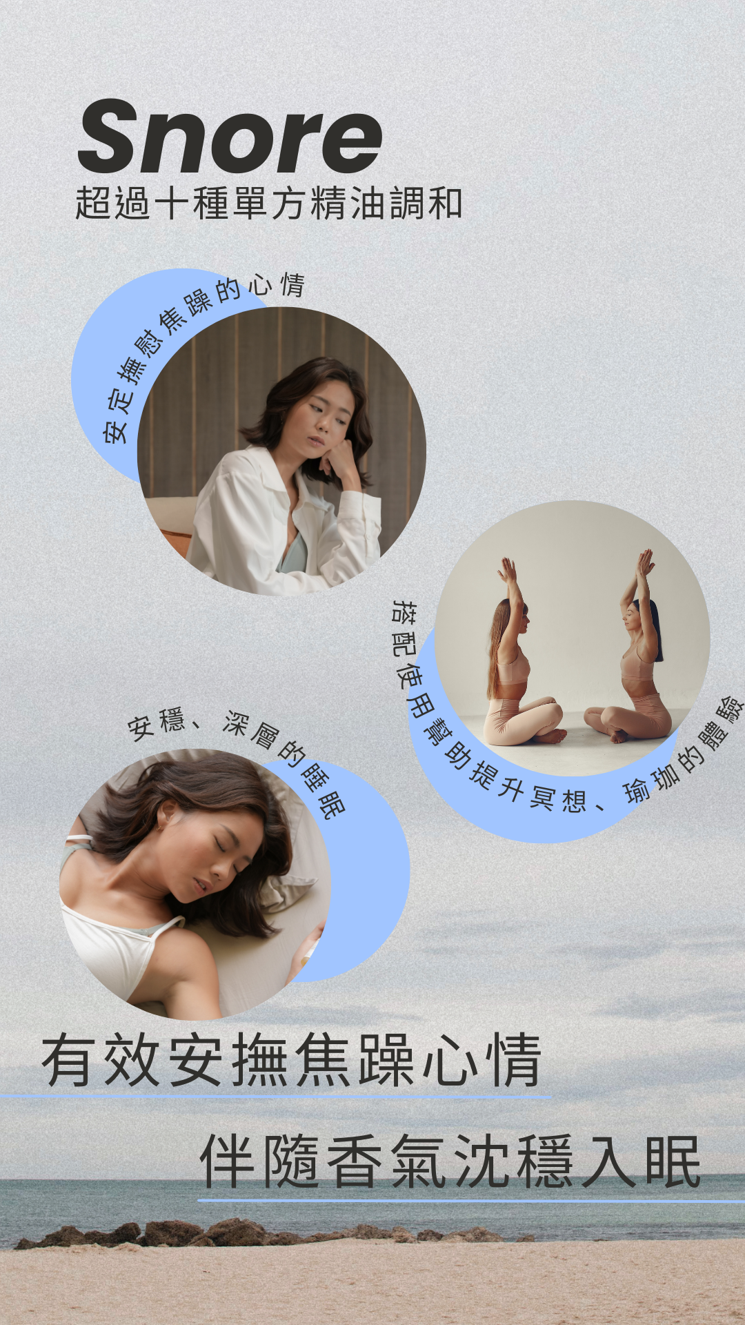 在感覺焦慮時,透過天然精油的香氣平穩交感神經、放鬆情緒。每一個晚安之際,在Snore 的作用下放下一天的辛勞,穩定入睡前的心緒、提升睡眠品質。