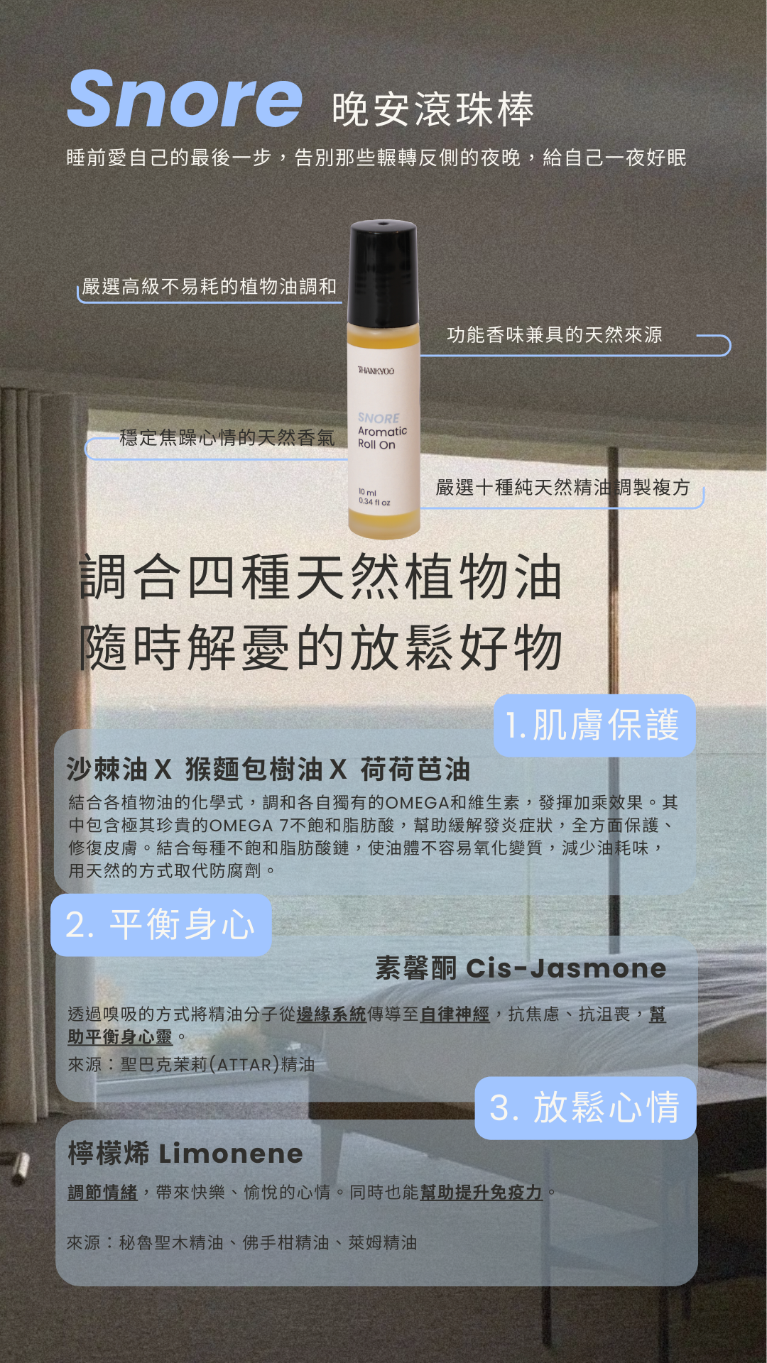 Snore 晚安滾珠棒使用 Snore 晚安精油 香氣並添加沙棘油、猴麵包樹油、荷荷芭油及甜杏仁油做為基底油。選擇搭配複方的植物油,延伸滾珠精油的功能性,包括抗敏及修護的功能,除此之外也透過四種不同植物油的特性,達到塗抹後讓香味擁有更加持香的效果。
